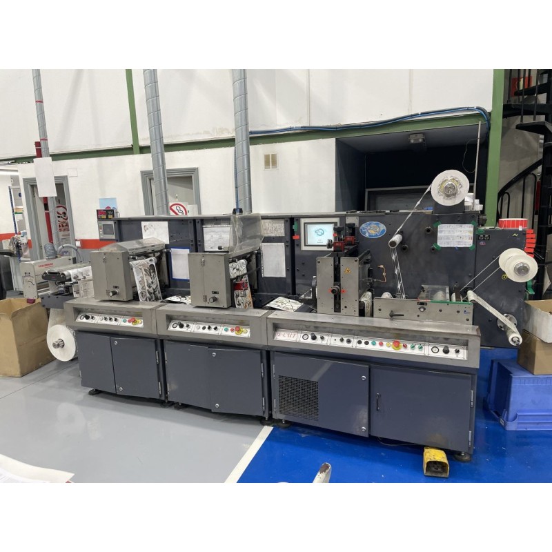 Unwinder with ultrasonic- web guide- Semi rotary die cutting- station - UV flexo full vanish- Slitter, waste, Rewinder- - Maximum web width 330 mm- Unwind roll max diameter 750 mm- Size of the semi rotary magnetic cylinder 20?? option 24??- Waste rewinder roll maximum diameter 600 mm- Rewind roll maximum diameter (with one rewind shaft) 600 mm- Speed (with flexo and semi-rotary die cut) Up to 45 meters/min- Speed (with full rotary flexo and laser die) Up to 90 meters/min- Accuracy +/- 0,125 mm- Electrical requirements 380 V tri + Earth- Pneumatical requirements 6 bars