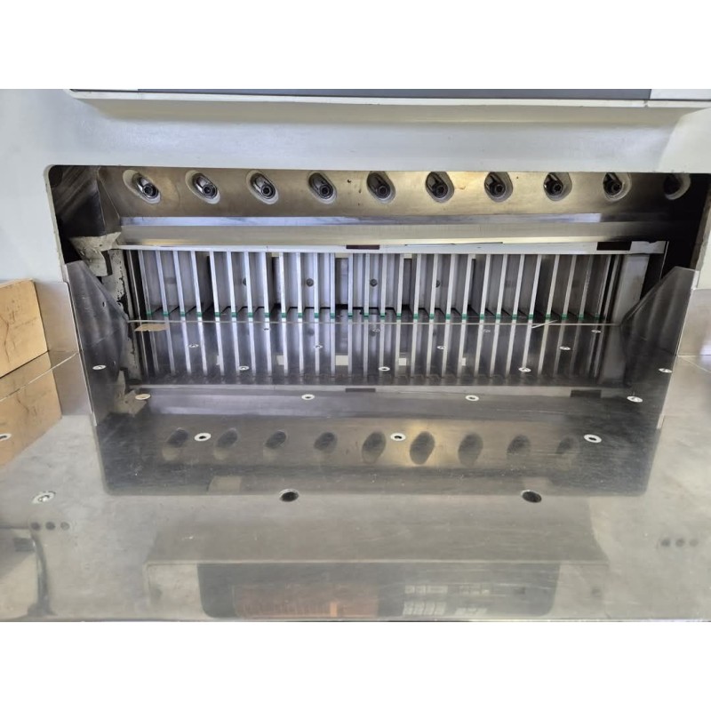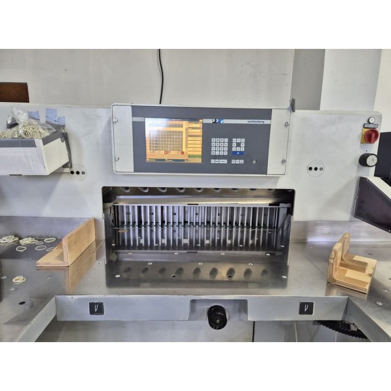 GUILLOTINE CUTTER FOR PAPER, PLASTIC, FOIL, CARDBOARD, LEATHER, ETC.- READY FOR OPERATION.- ROBUST CONSTRUCTION.- TECHNICAL DATA:- WORKING WIDTH 920 MM- STACK HEIGHT 120 MM- POWER SUPPLY 380V- WEIGHT 1900 KG- EQUIPMENT:- COLOUR MONITOR- PROGRAMMER WITH STEP MEMORY FUNCTION, STRIPING, MATERIAL EJECTION, ETC. POLISH VERSION- EASY BLADE REPLACEMENT PROGRAMME- CHROME TABLE SURFACE- AIR TABLE (PLUS SIDE TABLES ALSO AIR-SUPPORTED)- HYDRAULIC PRESSURE WITH ADJUSTABLE FORCE- SAFETY GUARDS- PRESSURE BAR- 3 HSS KNIVES- SLITS- KNIFE REPLACEMENT AND SERVICE TOOLS- PAPER STACK KNOCKER- DTR DOCUMENTATION AND OPERATING INSTRUCTIONS.- -