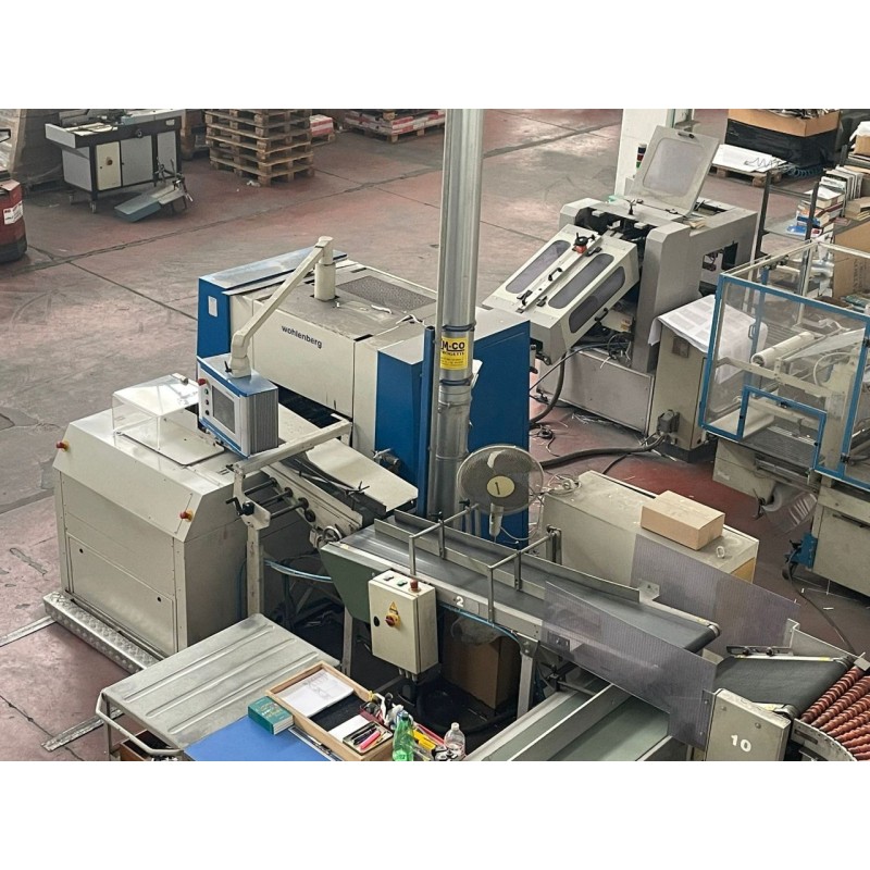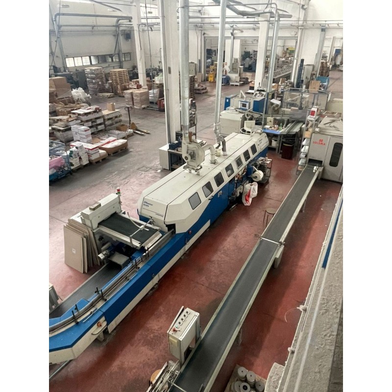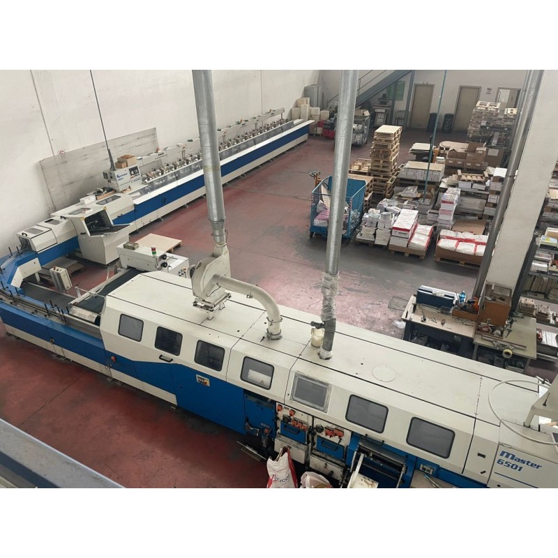 MASTER 6501- 19 CLAMPS- HOT MELT GLUEING SPINE AND SIDE- GAUZING STATION- AUTOMATIC BOOK FEEDER- COVER FEEDER- NIPPING STATION- TRIMMER WOHLENBERG TRIM TEC 75I-2003- STACKER ENTER SOLEMA FAST BOOK - STACKER EXIT SOLEMA GIOVE- WOHLENBERG SPRINTER 16 STATIONS- MAX SIZE 430X320mm- MIN SIZE 140X105mm- MAX COVER SIZE 435X645mm- MAX SPEED 6500 CYCLES/H- MAX BOOKBLOCK THICKNESS 62mm- MIN BOOKBLOCK THICKNESS 2mm- MILLING STATION- ROUGHENING STATION